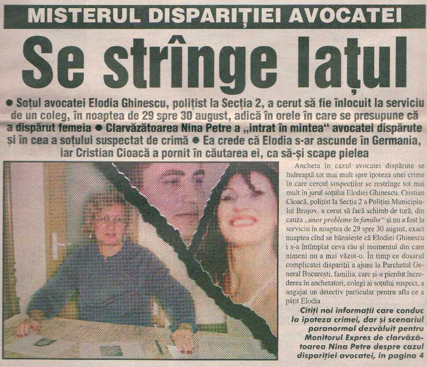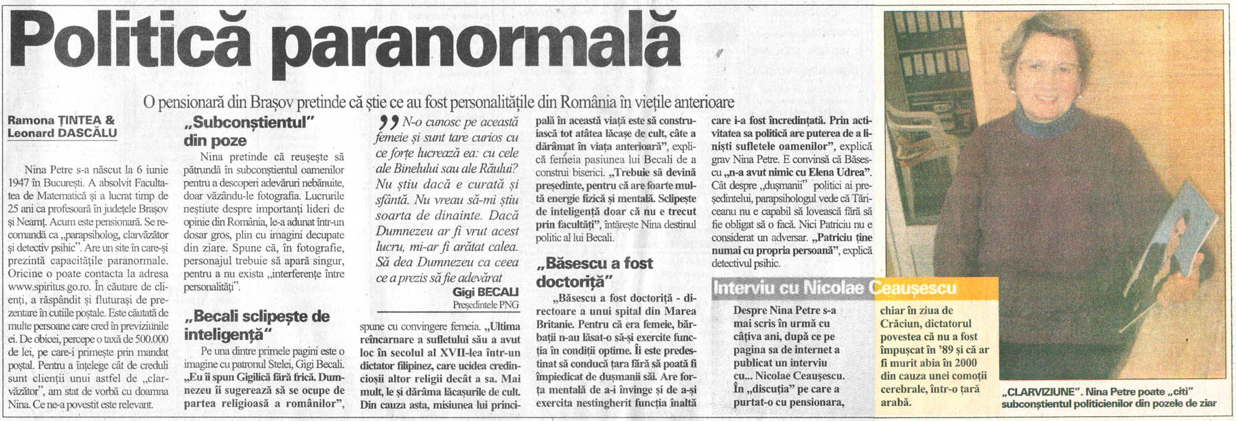 Având capacitatea de a comunica cu entităţile astrale, Nina Petre a chemat până acum aproape 2.000 de suflete din lumea de dincolo. Inclusiv pe cele ale soţilor Ceauşescu. Despre fostul dictator comunist, ea spune că nu a murit răpus de gloanţele soldaţilor în decembrie 1989, ci a fost scos din ţară şi s-a refugiat într-o ţară arabă condusă de un lider apropiat lui. "De aceea a fost şi tot războiul acela electronic, ca să acopere deplasarea lui în afara graniţelor ţării. Nu el, ci o sosie a lui a pierit, atunci, în decembrie. Elena a fost indusă în eroare, promiţându-i-se că va fi salvată ulterior. Dar nici ea, nici personajul care a jucat rolul lui Ceauşescu n-au ştiut că vor fi puşi la zid şi executaţi cu adevărat. Uitaţi-vă cum arăta acel presupus Ceauşescu - chiar şi căzut pe spate în faţa acelui zid de la Târgovişte - şi asta chiar după câteva zile în care fusese hărţuit de toată lumea. El, un om bolnav de diabet, părea solid ca un taur. Ceauşescu a murit abia acum câţiva ani, acolo departe, în acea ţară”. Multă lume apelează la Nina Petre pentru a stabili un contact cu o persoană dragă decedată sau pentru a afla misterul morţii acesteia. De fapt, ea poate să "vadă” pe un ecran mental tot ce s-a întâmplat la locul unei crime. Nu prin ochii ucigaşului sau ai victimei, ci ca un observator din afară care priveşte un film teribil, intrând în contact telepatic cu "eroii” acţiunii. Aşa a ajuns să colaboreze şi cu poliţia care i-a cerut ajutorul, pe diferite căi, în cazuri grele. A devenit de notorietate uciderea farmacistelor din Braşov acum doi ani. Deşi arestat e un tânăr, Alexandru Diaconescu, Nina Petre a spus de la început că adevăratul făptaş e altul, un anume Ion Cojocaru, care a reuşit să fugă în SUA, Diaconescu fiind doar martor la crime. Dar poliţia are nevoie de dovezi palpabile pentru a aresta pe cineva. "Poliţiştii şi-ar dori o colaborare mai strânsă cu mine, cu parapsihologii în general, dar nu există un cadru legal pentru asta. Nu e reglementată folosirea persoanelor cu aptitudini extrasenzoriale în anchete oficiale. Aşa că nu-mi rămâne decât să ofer familiilor celor implicaţi ceea ce aflu prin capacităţile mele”. Pentru că e vorba de un caz recent, o întreb de situaţia micuţei Roxana din Braşov, dispărută de acasă şi pe care o caută toată România. "Am povestit câtorva jurnalişti locali ce am aflat. Din păcate, fetiţa e moartă, trupul ei fiind aruncat undeva, la o groapă de gunoi de lângă Bucureşti, în Chitila, iar peste ea s-a prăvălit mult moloz. A fost vorba de o răzbunare, tatăl ei având o datorie de plătit. Pentru că nu a făcut-o, acei oameni s-au răzbunat ucigând-o pe micuţă. Pentru mine e foarte clar, am văzut mental şi duba cu care a fost transportată”.