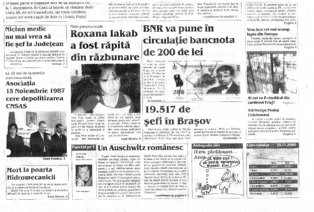 | 15 nov 2006 | Cotidianul BUNĂ ZIUA BRAŞOV | 5 | "Roxana Iakab a fost răpită din răzbunare" | Liviu Cioineag |