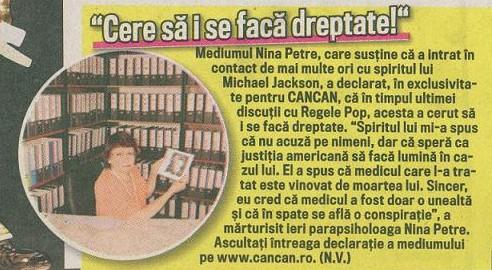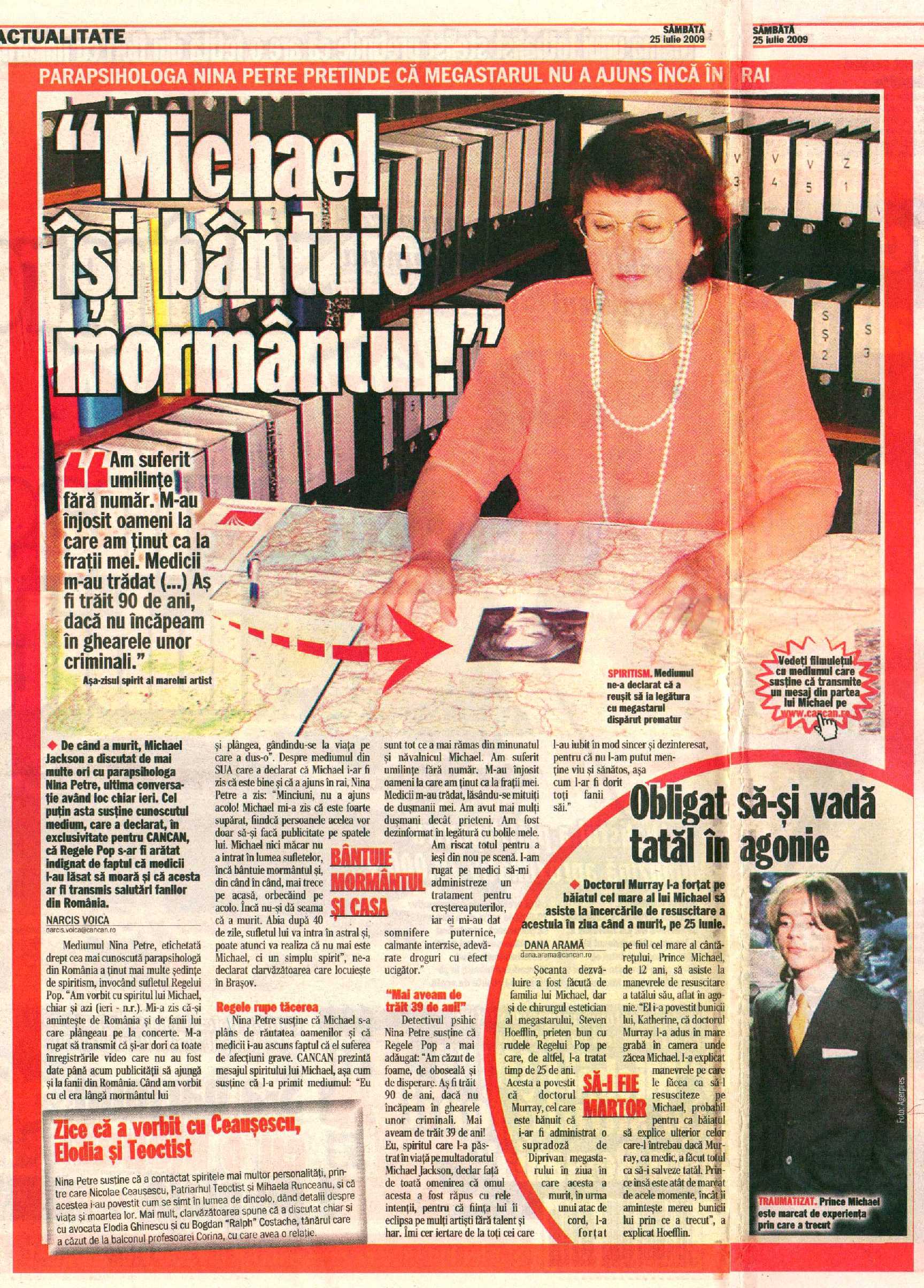 | 25 iul 2009 | Cotidianul CANCAN | 1, 2 | "Michael îşi salută fanii din România. Parapsihologa Nina Petre pretinde că megastarul nu a ajuns încă în rai." | Narcis Voica |