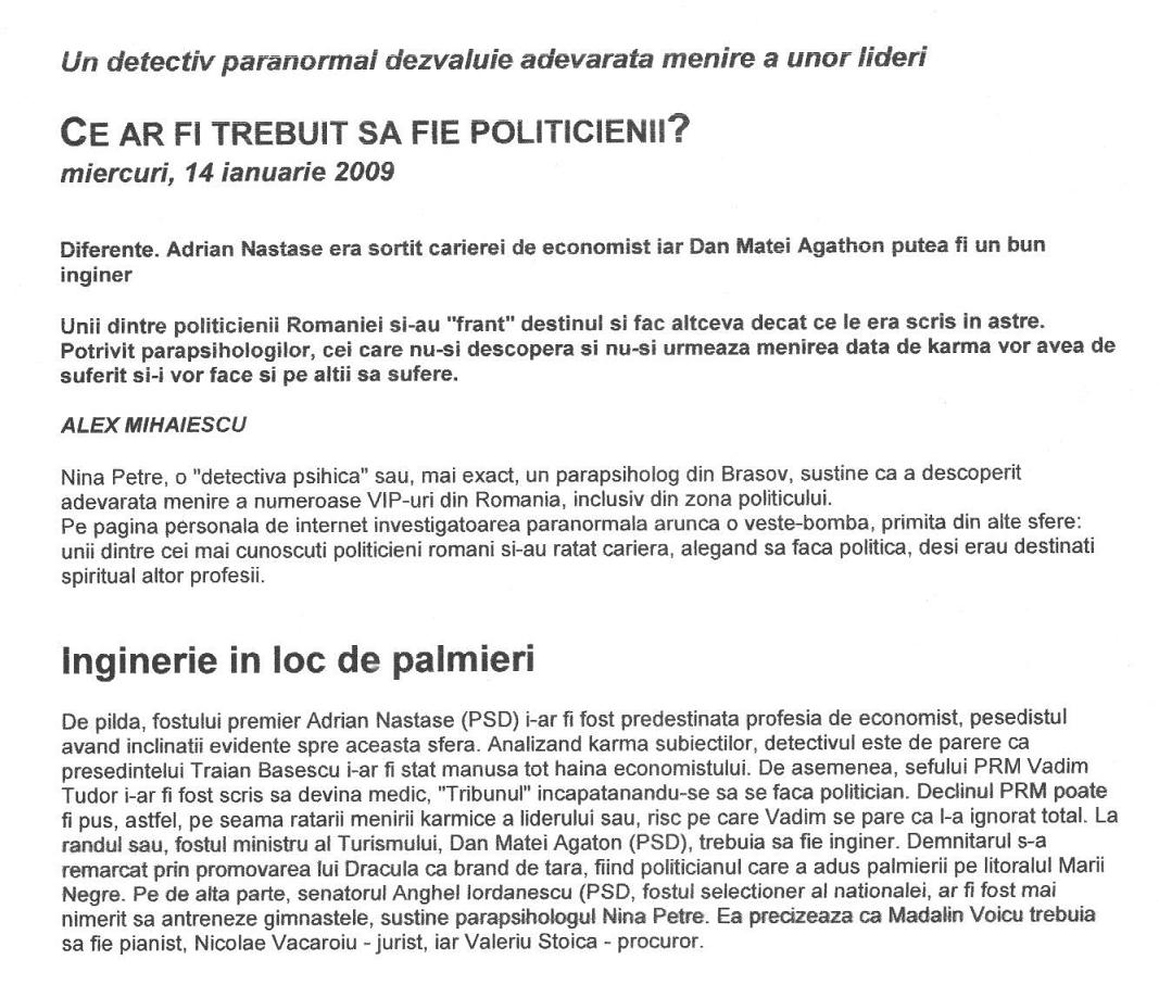| 14 ian 2009 | Cotidianul CANCAN | "Un detectiv paranormal dezvăluie adevărata menire a unor lideri. Ce ar fi trebuit sa fie politicienii?" | Alex Mihaiescu | B/W | |