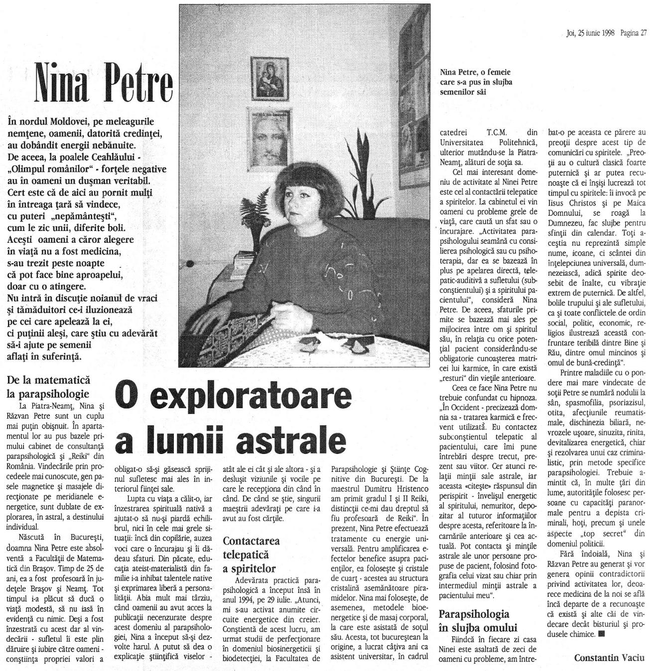 | 25 iunie 1998 | Cotidianul CURENTUL | 27 | "Nina Petre - o exploratoare a lumii astrale" | Constantin Vaciu | B/W |