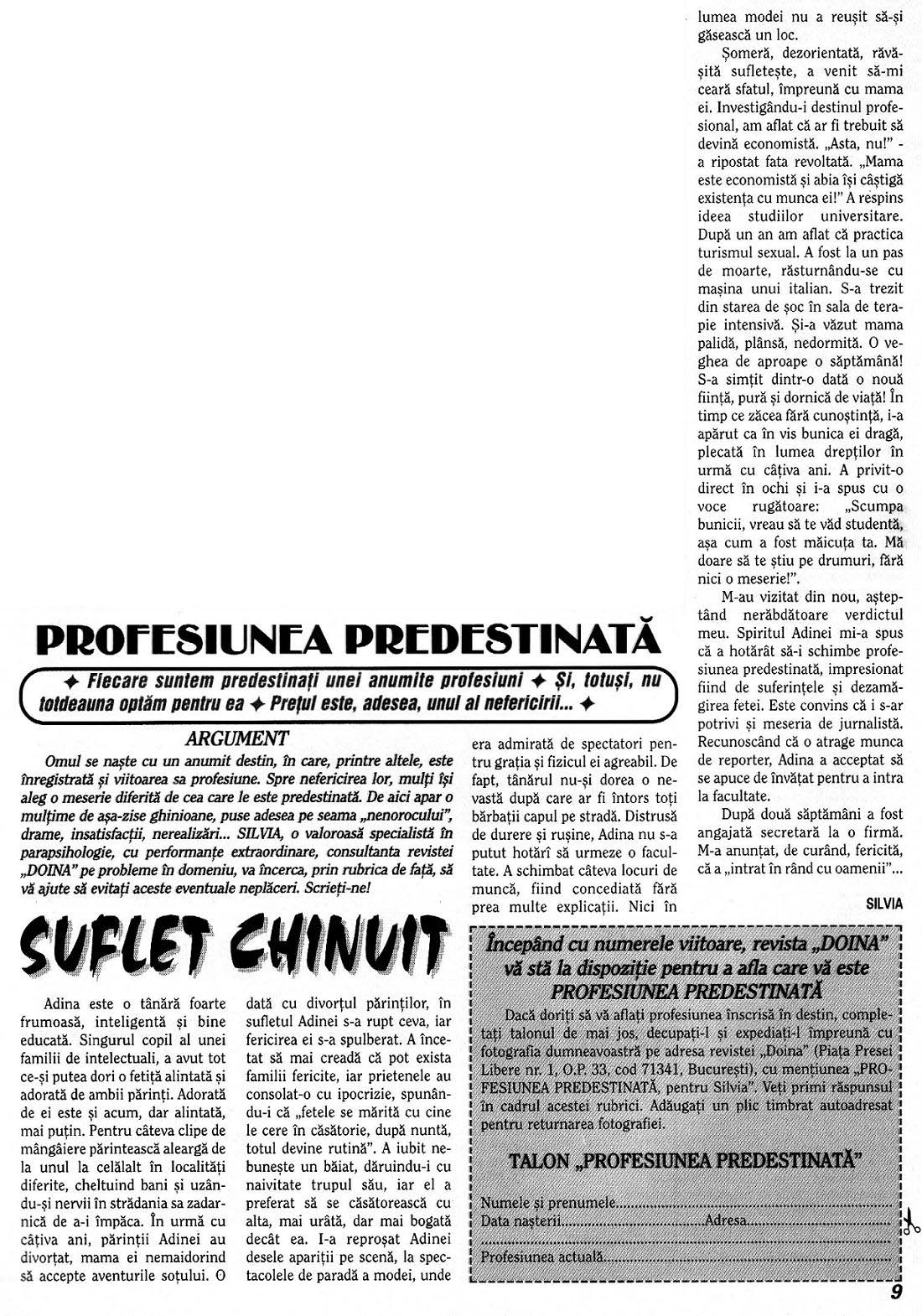 | Oct 1999 | Revista DOINA nr.10 | 9 | Profesiunea predestinată: "Suflet chinuit", Silvia | Nina Petre | B/W |