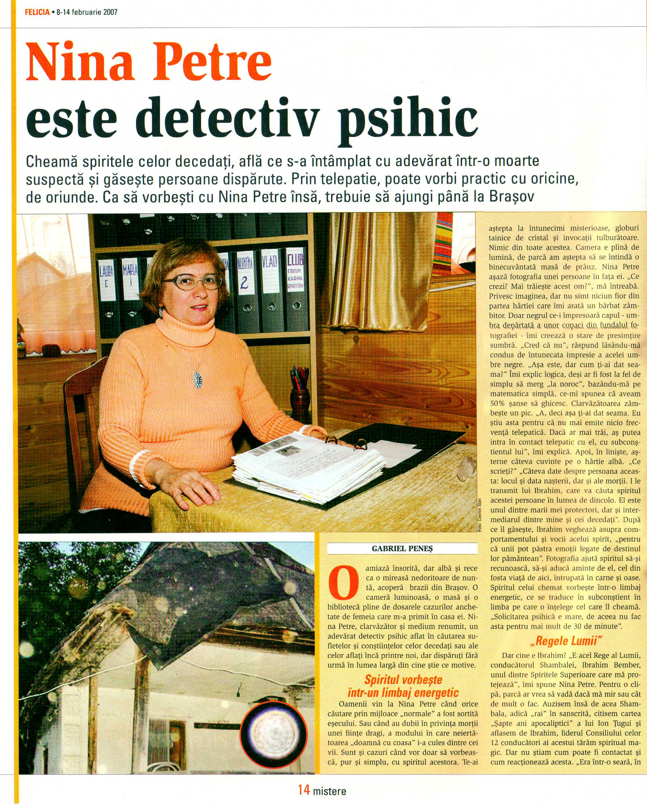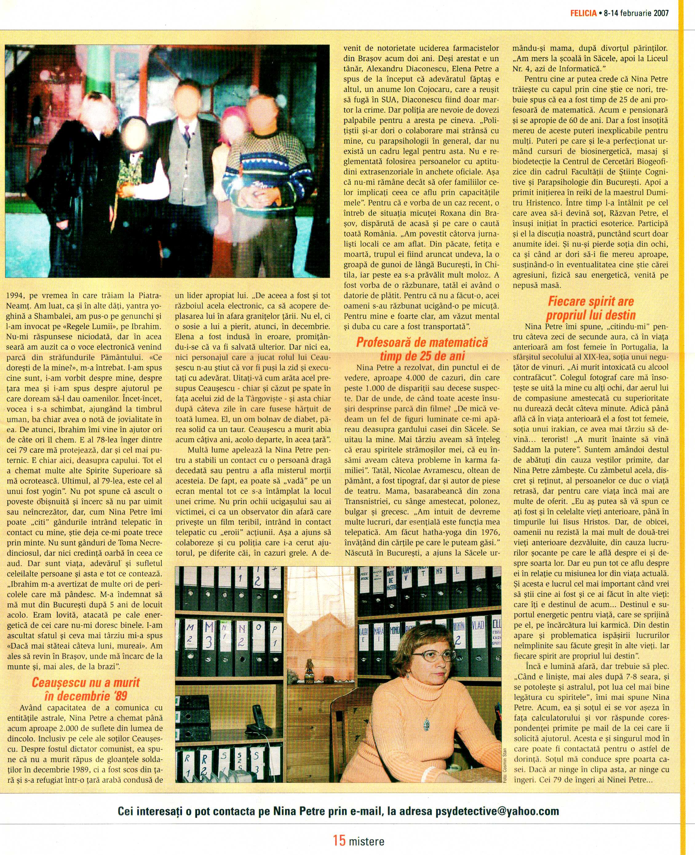 | 8 feb 2007 | Revista FELICIA | 14, 15 | "Nina Petre este detectiv psihic" | Gabriel Peneş |
