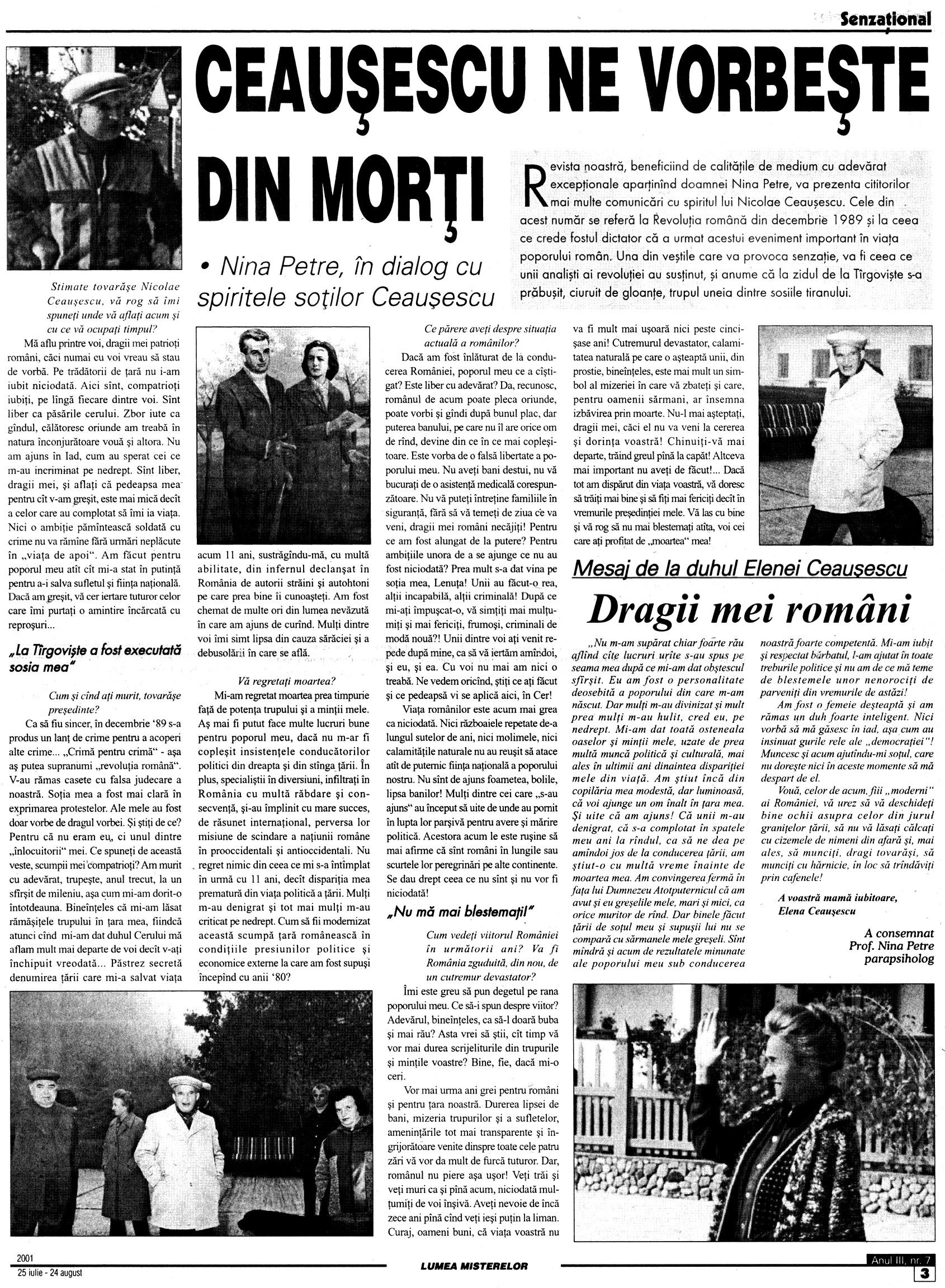 | 25 iul - 24 aug 2001 | Revista LUMEA MISTERELOR | 3 | "Ceauşescu ne vorbeşte din morţi" | Nina Petre | B/W |