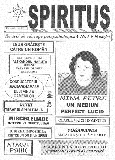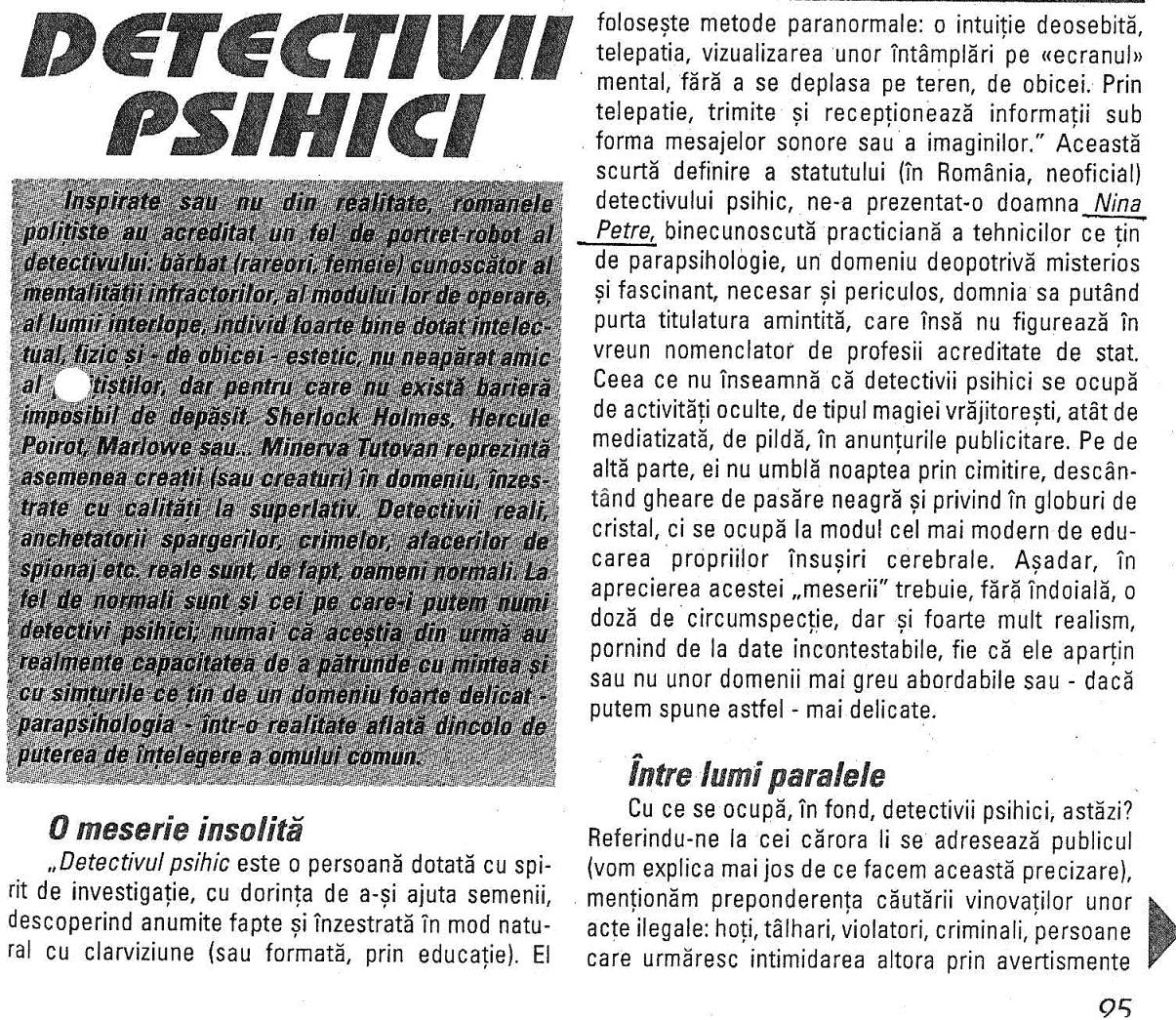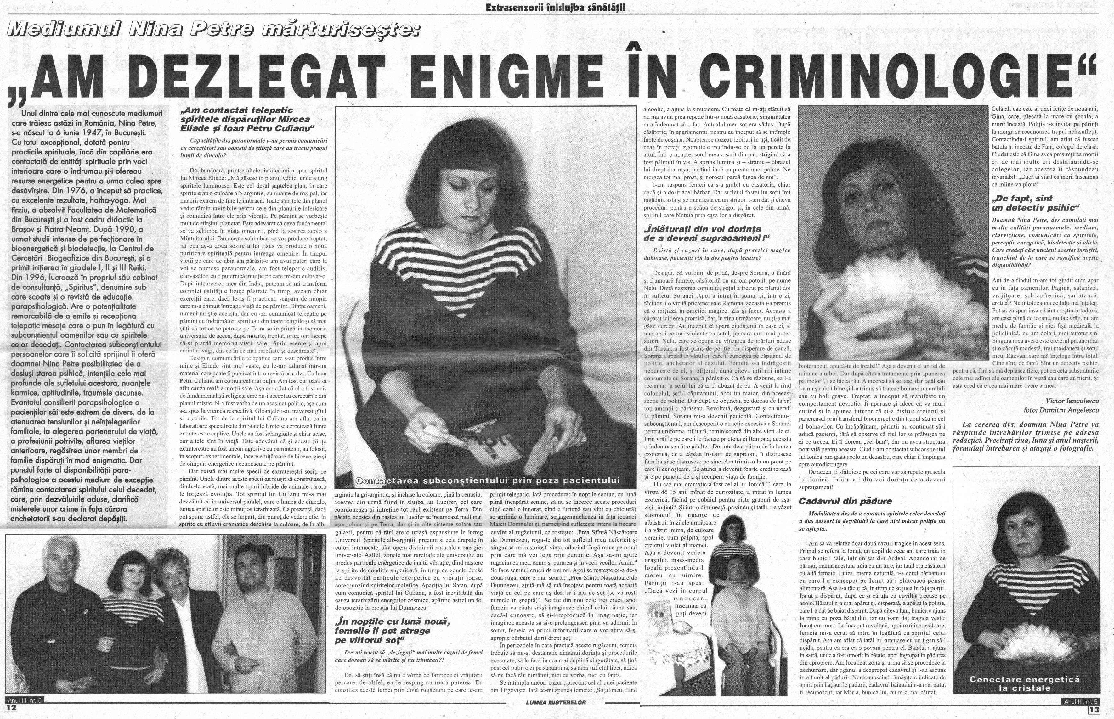 | 25 mai-24 iun 2001 | Revista LUMEA MISTERELOR | 12, 13 | "DETECTIVUL SPIRITELOR - Mediumul Nina Petre a