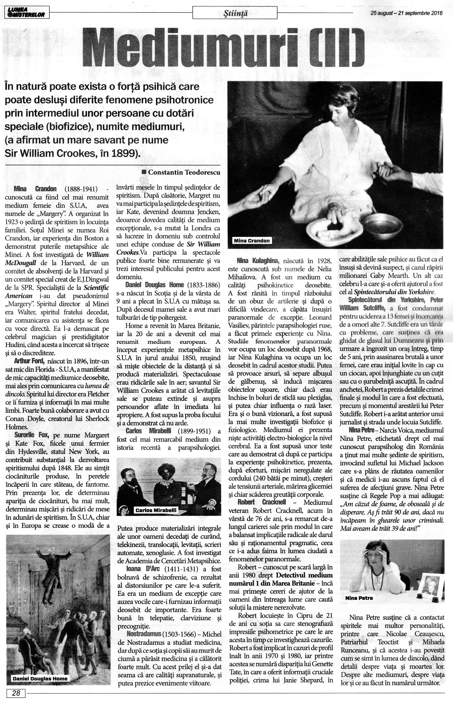 | 25 aug 2016 | Revista LUMEA MISTERELOR | 28 | Mediumuri (II) | Constantin Teodorescu | B/W |