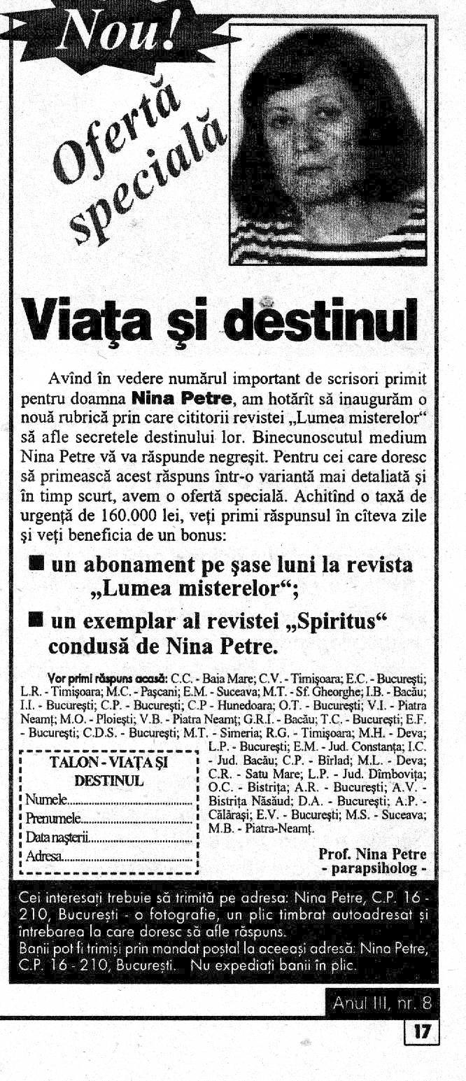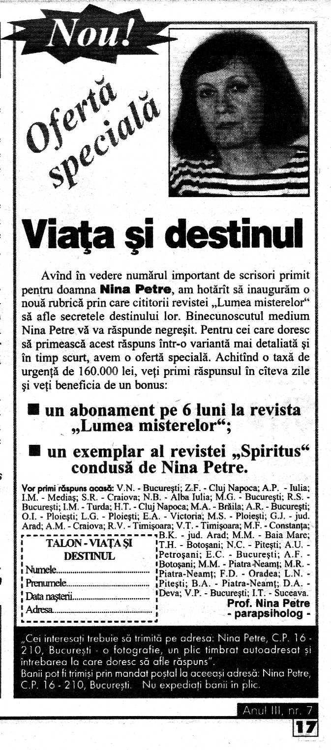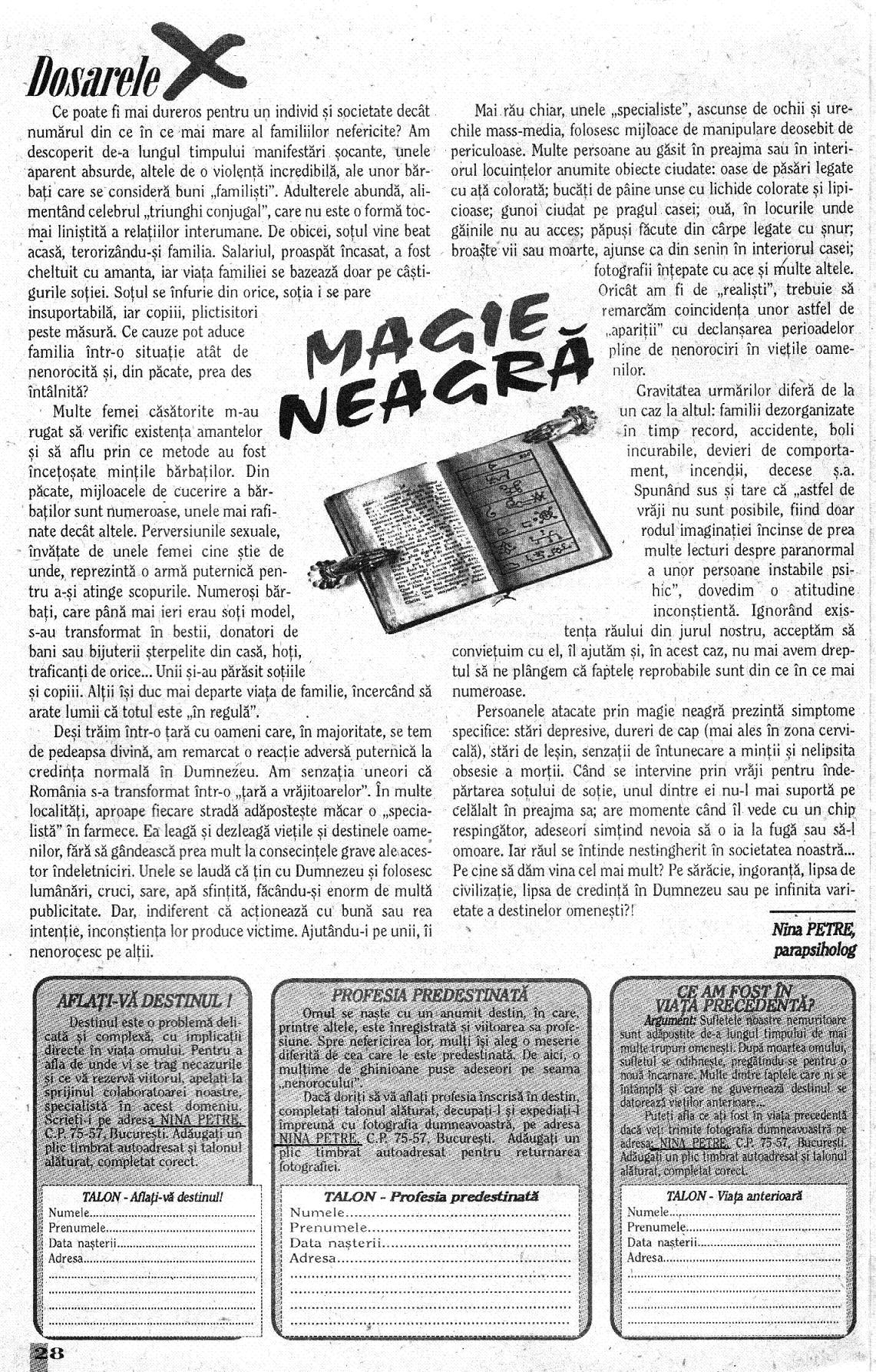 | Oct 2000 | Revista VIAŢA FĂRĂ SECRETE | 28 | "Magie neagră", Taloane (Profesia predestinată, Aflaţi-vă destinul, Viaţa anterioară) | Nina Petre | Col |