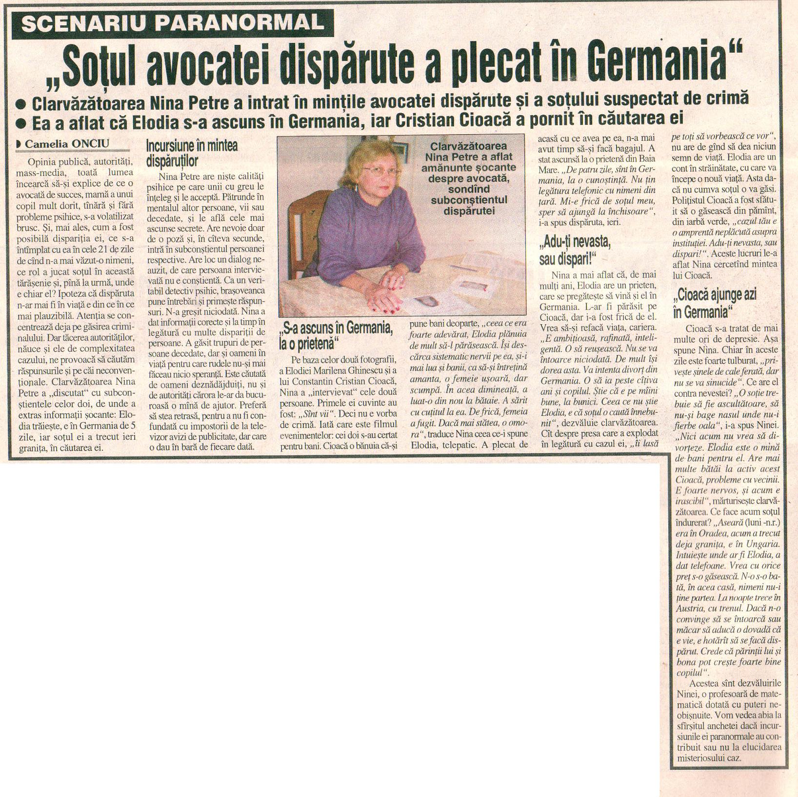 | 19 sep 2007 | Cotidianul MONITORUL EXPRES | 1, 4 | Scenariu paranormal despre dispariţia avocatei Elodia Ghinescu | Camelia Onciu | Col |