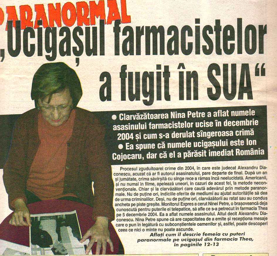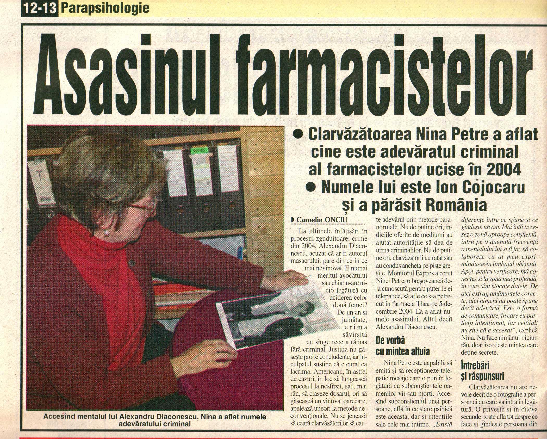 | 7 iun 2006 | Cotidianul MONITORUL EXPRES | 12, 13 | "Ucigaşul farmacistelor a fugit în SUA" | Camelia Onciu |