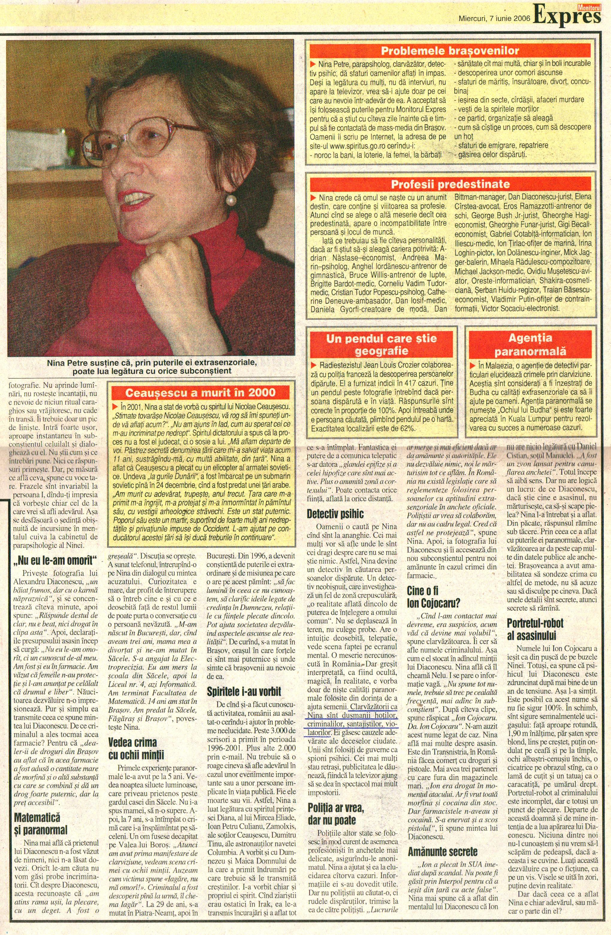 | 7 iun 2006 | Cotidianul TRANSILVANIA EXPRES (TexPlus) | 9 | Politică paranormală - Ce au fost personalităţile din România în vieţile anterioare | Ramona Ţi ntea Leonard Dascălu |