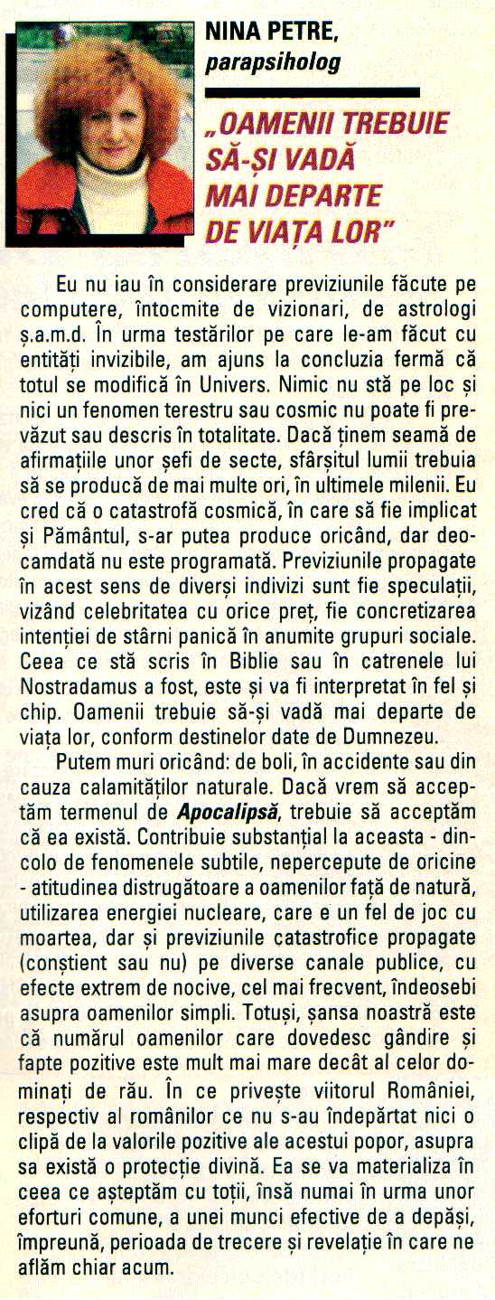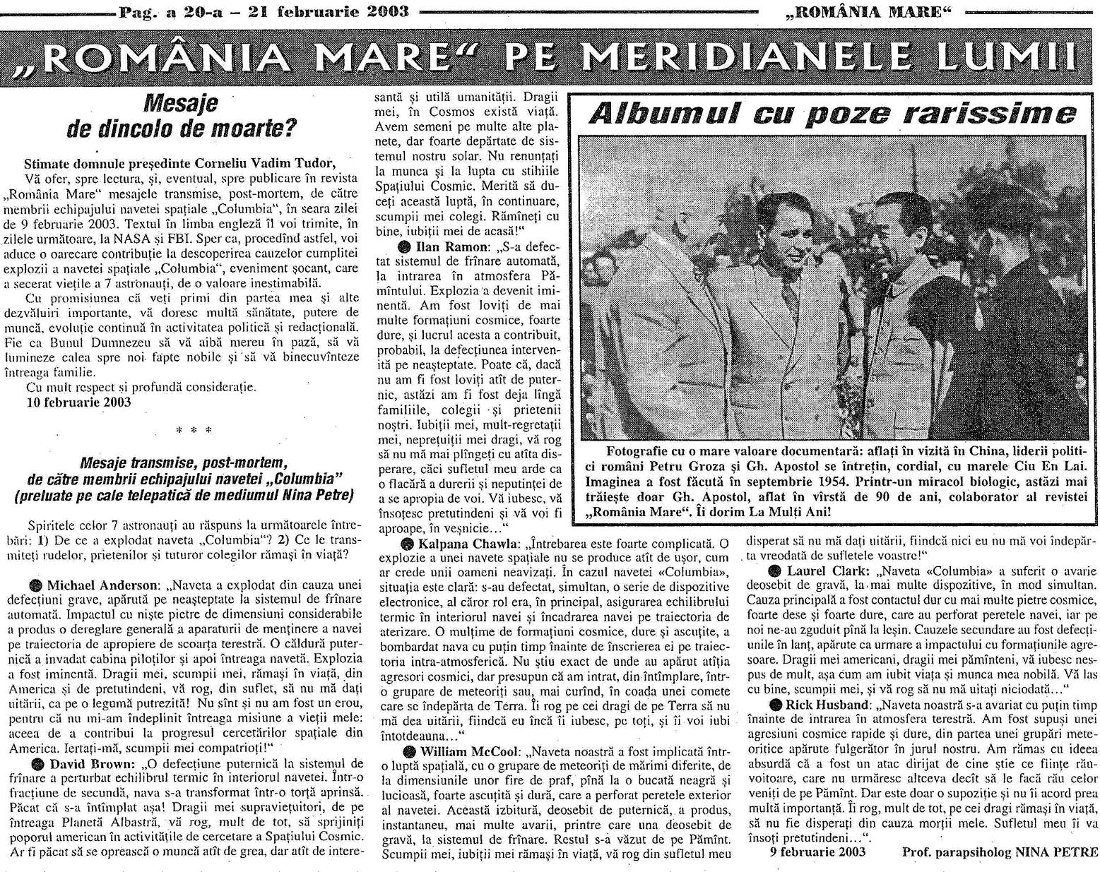 | 21 feb 2003 | Revista ROMÂNIA MARE | 20 | "Mesaje de dincolo de moarte" - de la spiritelor astronauţilor de pe naveta "Columbia" | Nina Petre | B/W |