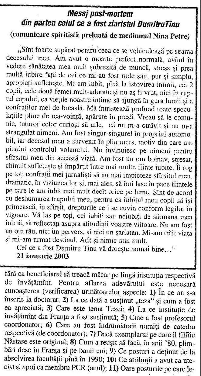 | 7 feb 2003 | Revista ROMÂNIA MARE | 23 | "Un mesaj al lui Dumitru Tinu de dincolo de mormânt" | Nina Petre | B/W |