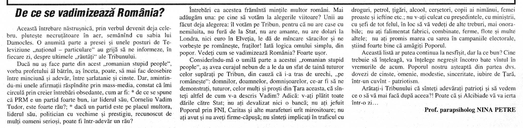 | 10 ian 2003 | Revista ROMÂNIA MARE | 16 | "De ce se vadimizează România?" | Nina Petre | B/W |