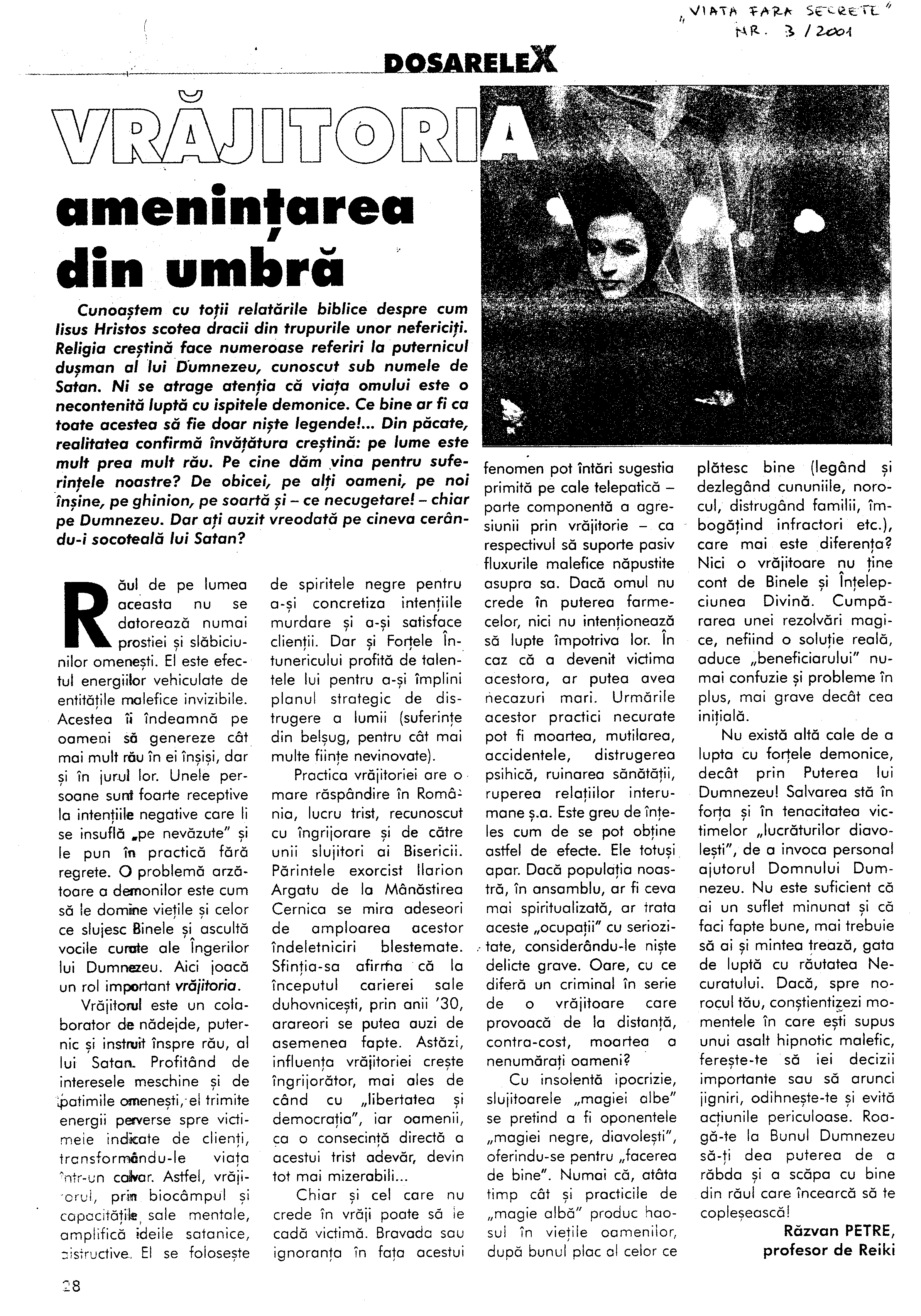 | Mar 2001 | Revista VIAŢA FĂRĂ SECRETE | 28 | "Vrăjitoria - ameninţarea din umbră" | Răzvan Petre | B/W |