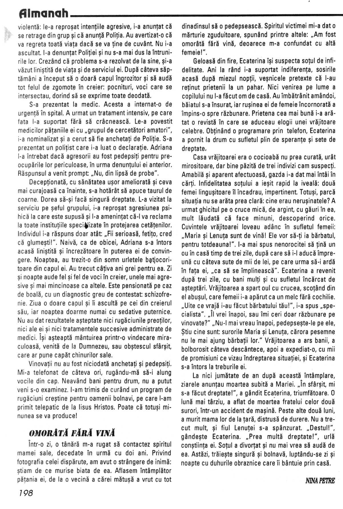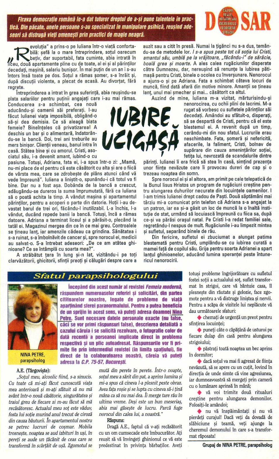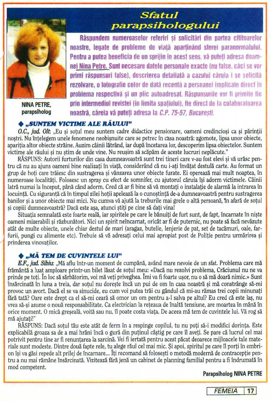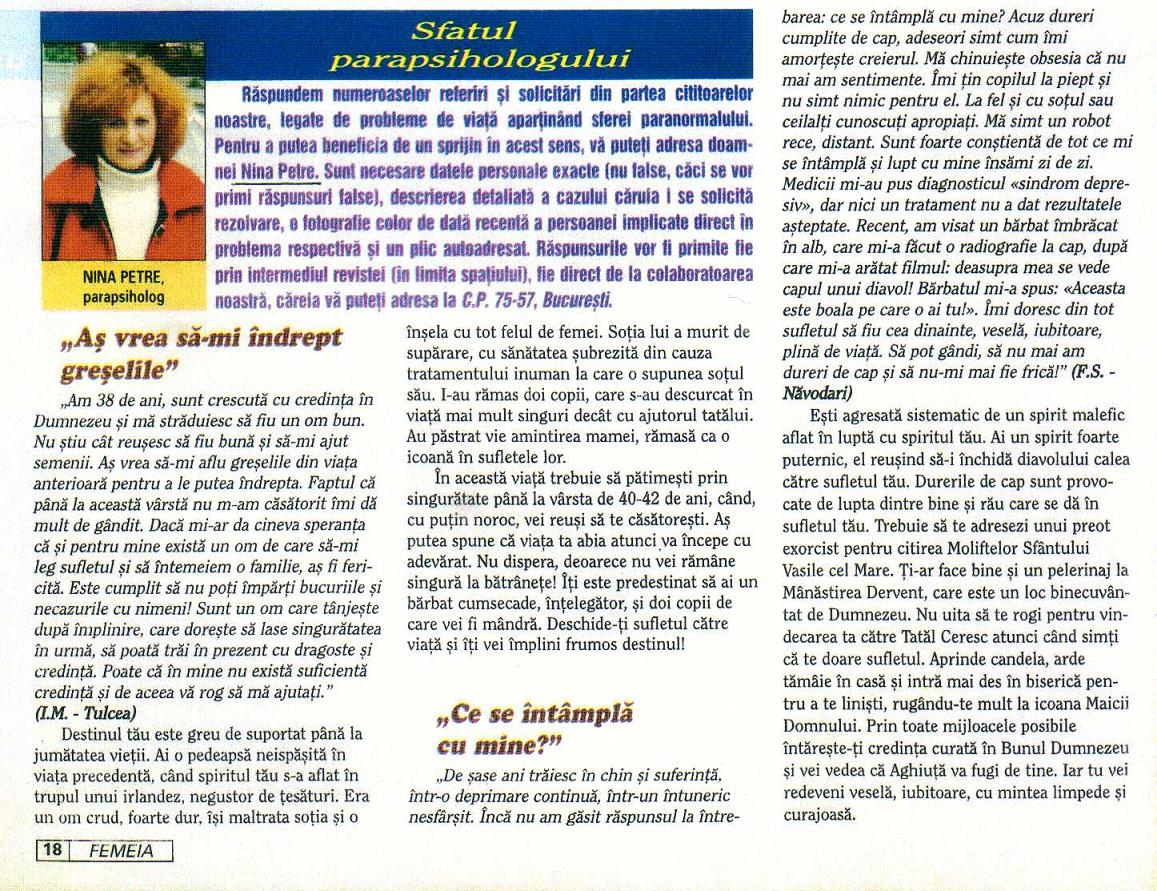 | Feb 2000 | Revista FEMEIA MODERNĂ | 17 | Sfatul parapsihologului: "Suntem victime ale răului", "Mă tem de cuvintele lui" | Nina Petre | Col |