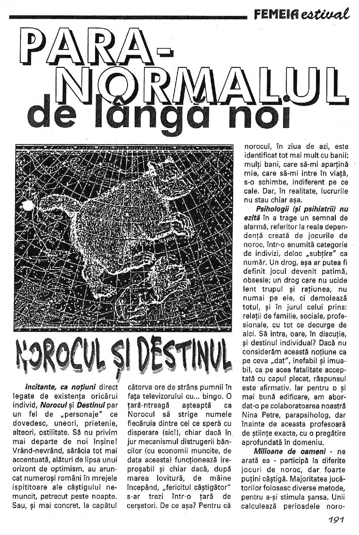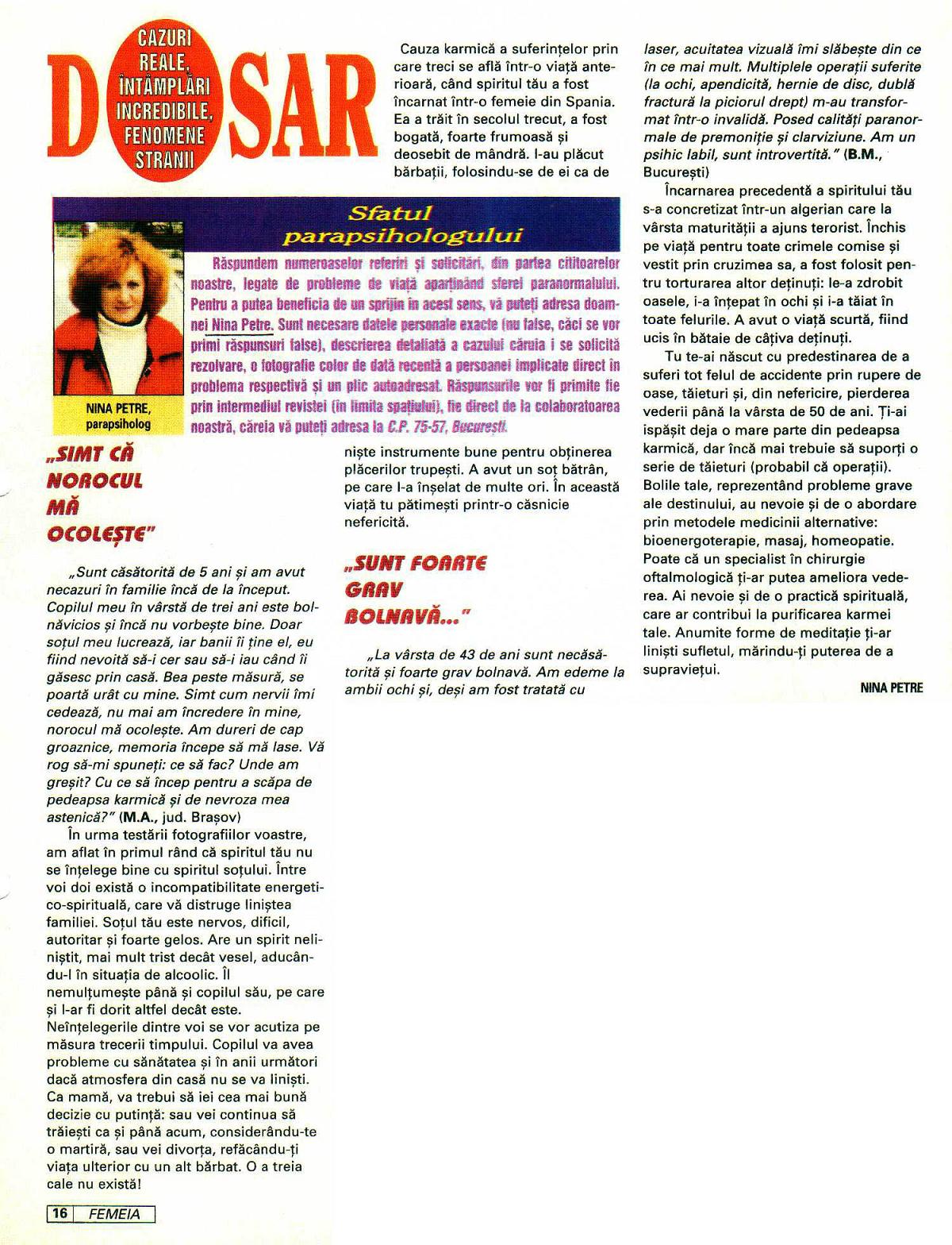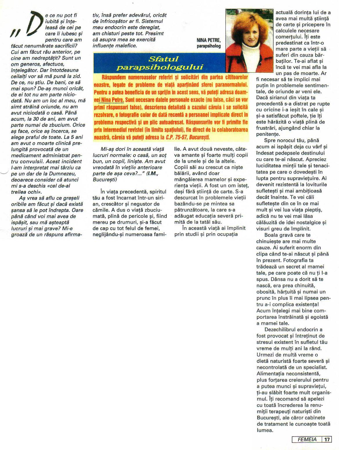 | Dec 1999 | Revista FEMEIA MODERNĂ | 16 | Sfatul parapsihologului: "Simt că norocul mă ocoleşte", "Sunt foarte grav bolnavă" | Nina Petre | Col |