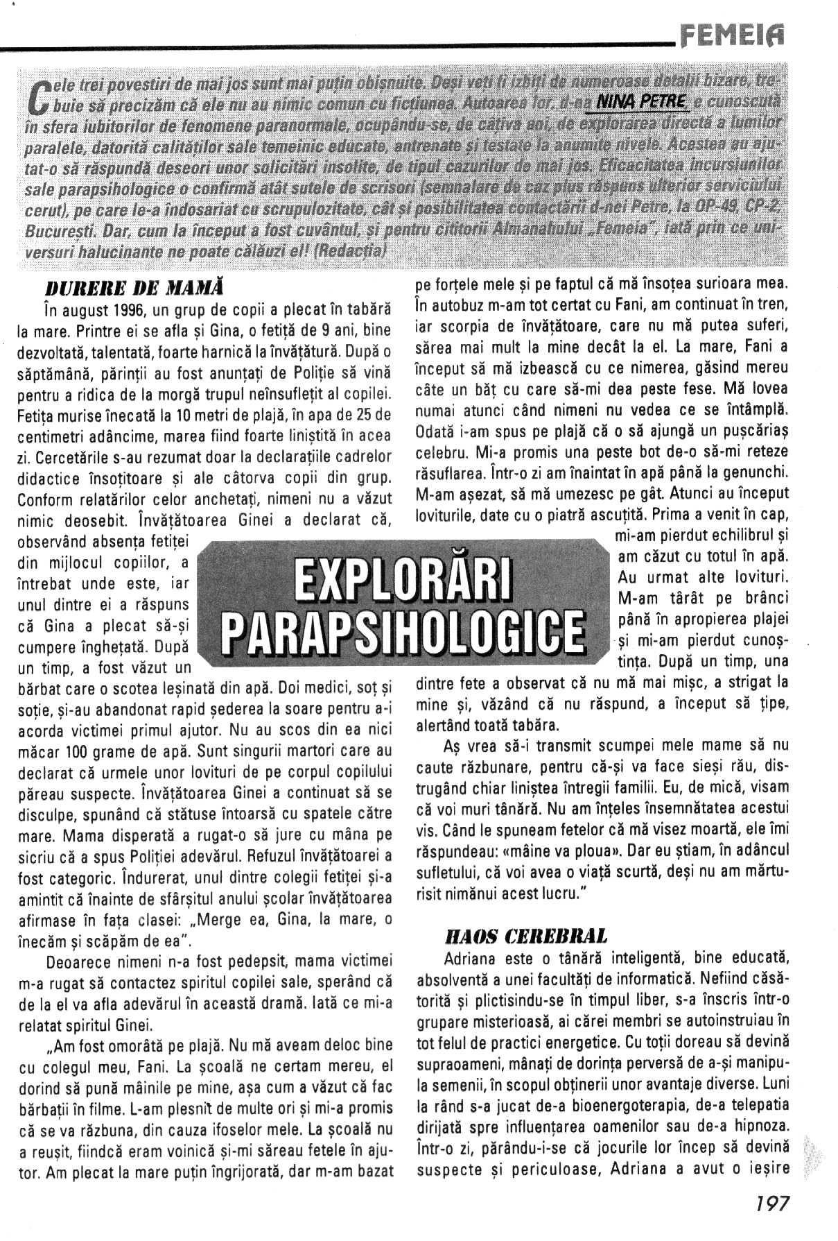 | 1999 | Almanah FEMEIA | 197 | Explorări parapsihologice: "Durere de mamă", "Haos cerebral", "Omorâtă fără vină" | Nina Petre |