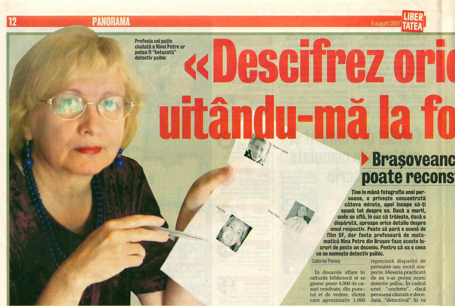 | 5 mar 2008 | Revista FLACĂRA | 24, 27 | "Detectivii psihici. Nina Petre anchetează prin telepatie şi clarviziune" | Liliana Petruş |