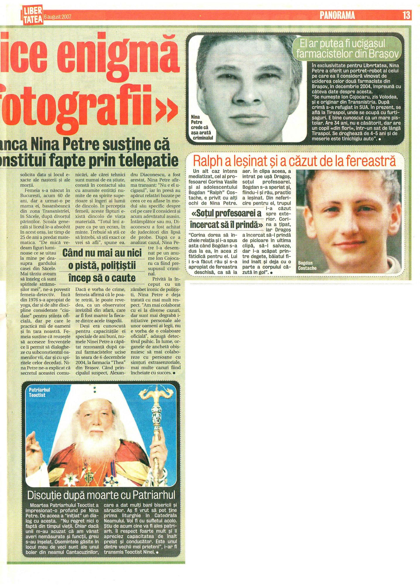 | 6 aug 2007 | Cotidianul LIBERTATEA | 12, 13 | "Descifrez orice enigmă uitându-mă la fotografii" | Gabriel Peneş |