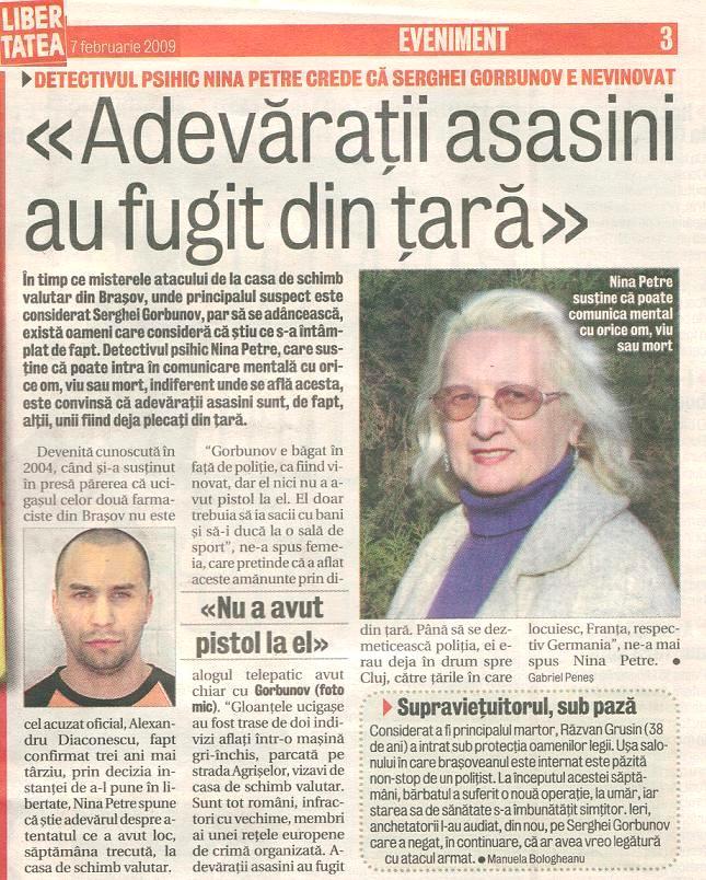 | 7 feb 2009 | Cotidianul LIBERTATEA | 3 | Detectivul psihic Nina Petre crede că Serghei Gorbunov e nevinovat. "Adevăraţii asasini au fugit din ţară" | Gabriel Peneş | Col |