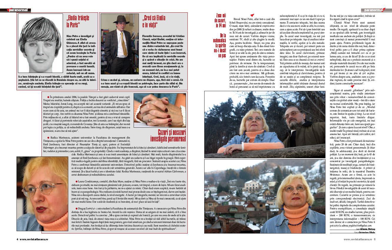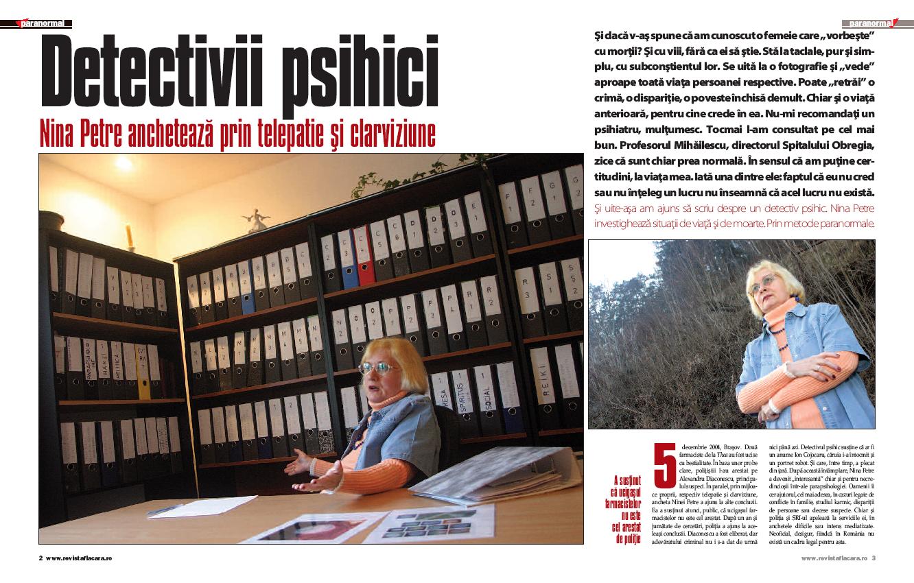 Detectivii psihiciNina Petre anchetează prin telepatie şi clarviziuneŞi dacă v-aş spune că am cunoscut o femeie care "vorbeşte" cu morţii? Şi cu viii, fără ca ei să ştie. Stă la taclale, pur şi simplu, cu subconştientul lor. Se uită la o fotografie şi "vede" aproape toată viaţa persoanei respective. Poate "retrăi"o crimă, o dispariţie, o poveste închisă demult. Chiar şi o viaţă anterioară, pentru cine crede în ea. Nu-mi recomandaţi un psihiatru, mulţumesc. Tocmai l-am consultat pe cel mai bun. Profesorul Mihăilescu, directorul Spitalului Obregia, zice că sunt chiar prea normală. În sensul că am puţine certitudini, la viaţa mea. Iată una dintre ele: faptul că eu nu cred sau nu înţeleg un lucru nu înseamnă că acel lucru nu există. Şi uite-aşa am ajuns să scriu despre un detectiv psihic. Nina Petre investighează situaţii de viaţă şi de moarte. Prin metode paranormale. A susţinut că ucigaşul farmacistelor nu este cel arestat de poliţie 5 decembrie 2004, Braşov. Două farmaciste de la Thea au fost ucise cu bestialitate. În baza unor probe clare, poliţiştii l-au arestat pe Alexandru Diaconescu, principalul suspect. În paralel, prin mijloace proprii, respectiv telepatie şi clarviziune, ancheta Ninei Petre a ajuns la alte concluzii. Ea a susţinut atunci, public, că ucigaşul farmacistelor nu este cel arestat. După un an şi jumătate de cercetări, poliţia a ajuns la aceleaşi concluzii. Diaconescu a fost eliberat, dar adevăratului criminal nu i s-a dat de urmă nici până azi. Detectivul psihic susţine că ar fi un anume Ion Cojocaru, căruia i-a întocmit şi un portret robot. Şi care, între timp, a plecat din ţară. După această întâmplare,Nina Petre a devenit "interesantă" chiar şi pentru necredincioşii într-ale parapsihologiei. Oamenii îi cer ajutorul, cel mai adesea, în cazuri legate de conflicte în familie, studiul karmic, dispariţii de persoane sau decese suspecte. Chiar şi poliţia şi SRI-ul apelează la serviciile ei, în anchetele dificile sau intens mediatizate. Neoficial, desigur, fiindcă în România nu există un cadru legal pentru asta. Nina Petre a investigat şi celebrul caz Elodia Ghinescu. A aflat că avocata a plecat din ţară la indicaţia serviciilor secrete şi că acum locuieşte la Paris: "Pentru că nu avea voie să-i spună soţului ei adevărul, a fost nevoită să provoace o ceartă banală. Acum lucrează într-un notariat, sub un alt nume. S-a tuns băieţeşte şi s-a vopsit blondă, a slăbit foarte mult, arată ca o puştoaică. Ştie tot ce se discută în România despre ea, se uită la televizor, urmăreşte ancheta. Elodia trăieşte cu speranţa că va reuşi, curând, să îşi scoată băieţelul din ţară". "Cred că Elodia e în viaţă“ Florentin Sorescu, avocatul lui Cristian Cioacă, soţul Elodiei, susţine că informaţiile Ninei Petre se suprapun peste una dintre variantele lui: "Eu cred fie că e vorba de răzbunarea unei femei care simte că toate iţele i s-au încurcat, fie că era implicată în serviciile secrete şi a apărut o situaţie de criză. Nu am mai mulţi termeni, nu ştiu dacă era o avocată care făcea aranjamente şi, la un moment dat, nu le-a mai putut onora, intrând în conflict cu lumea interlopă. Cred, însă, că e în viaţă. Crima o exclud şi, oricum, un cadavru nu dispare, aşa, fără nici o urmă. Că s-a tuns scurt şi s-a vopsit blondă se potriveşte, face parte din stilul ei. Din mesaje, am văzut că ştie franceză, aşa că s-ar putea descurca la Paris". “Am cunoscut nişte băieţi excepţionali, din poliţie şi serviciile secrete. Vin la mine în casă, mă consultă, discutăm. Discret şi... neoficial. Nici un poliţist nu va recunoaşte vreodată că a vorbit cu mine", susţine Nina Petre. Aşa este, am verificat. Solicitările noastre către Poliţia din Braşov şi SRI, pe această temă, nu au primit nici un răspuns. Cazuri şi necazuri investigate paranormal