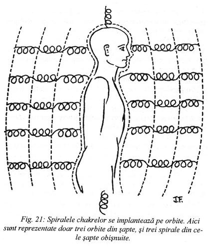 Din Fig.4 reţinem ideea că chakra se implantează pe corpul eteric. Vom considera, ca o completare logică, că fiecare corp subtil are la suprafaţa sa o chakră (o vom boteza "subchakră"!) aliniată cu celelate 6. Deci, ceea ce Janine Fontaine a detectat prin feeling nu este o mişcare elicoidală continuă traversând orbitele, ci o succesiune de 7 elici diferite.