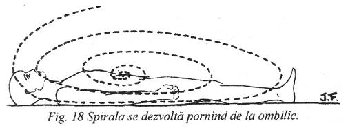 3 – Janine Fontaine a mai detectat o mişcare secundară a energiei emanate de orice chakră, şi anume o spirală plană, mai largă, ce se întinde progresiv pe suprafaţa corpului (pag.81). Un exemplu tipic este cel al chakrei buricului (Nabhi chakra) (pag.173). Vezi Fig.9. Găsim astfel şi confirmarea celui de-al treilea element al arhetipului dinamic urmat de quasar, care este spirala plană.