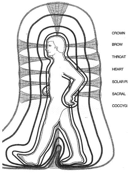 În Fig.3 apar şi aşa-zisele învelişuri sau corpuri subtile, menţionate în tratatele yoghine. Ele cuprind corpul omenesc într-un mod similar foiţelor de ceapă sau păpuşilor ruseşti Matrioşka. Primul înveliş subtil este cel eteric, care dublează organismul fizic, dar îl depăşeşte cu puţin – limita sa exterioară este situată la câţiva milimetri deasupra pielii. Următoarele învelişuri sunt formate din materie tot mai rafinată, mai greu de detectat, iar marginile lor se distanţează între ele la circa 30-40 centimetri (valori aproximative şi variabile).