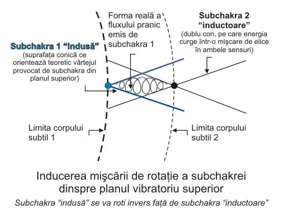 Cum subchakra inductoare se găseşte într-o dimensiune ce vibrează cu o frecvenţă superioară, ea este invizibilă din perpectiva subchakrei induse. Acest fapt l-a determinat pe Arthur E. Powell să scrie că "prana astrală ţâşneşte în centrul chakrei eterice, venind dintr-o a patra dimensiune şi inducând mişcarea pranei de-a lungul spiţelor chakrei eterice". ("Dublul eteric şi fenomenele conexe", pag.25)