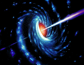 În Fig.8, avem reprezentarea unui quasar, care este un miez activ de galaxie cosmică. Observăm mişcarea de rotaţie spiralată în jurul unui centru, precum şi cele două jeturi de particule expulzate de-a lungul axului de rotaţie. Deşi nu apare evident în desen, cele două fluxuri de particule sunt emise după traiectorii elicoidale şi în sensuri de rotaţie opuse. În limbaj fizico-matematic, cei doi vectori "moment de rotaţie" paraleli cu axa sunt egali ca mărime, dar de sensuri opuse – pentru a se echilibra. (Luând ca referinţă focarul, putem spune că ambele mişcări de rotaţie trebuie să fie ori levogire, ori dextrogire.)