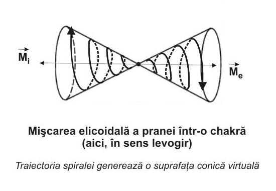 În desenul de mai sus am reprezentat simplificat deplasarea energiei într-o chakră. Din focarul inserat pe suprafaţa corpului subtil, chakra emite energie sub forma a două "vârtejuri" opuse ca direcţie şi sens de rotaţie: o direcţie îndreptată spre exterior (vectorul de rotaţie Me) şi cealaltă, spre interiorul câmpului (vectorul Mi).