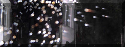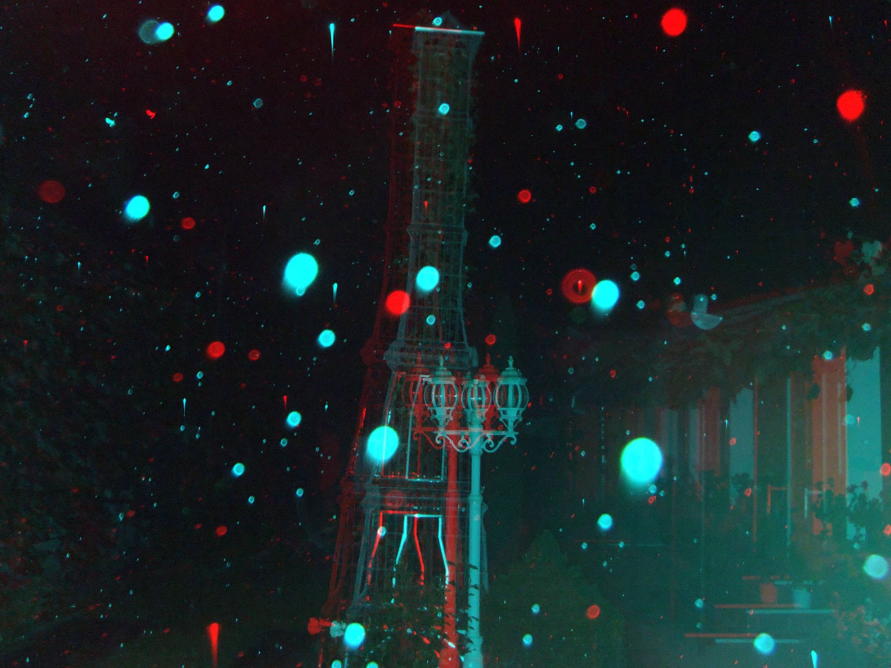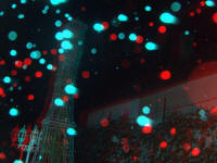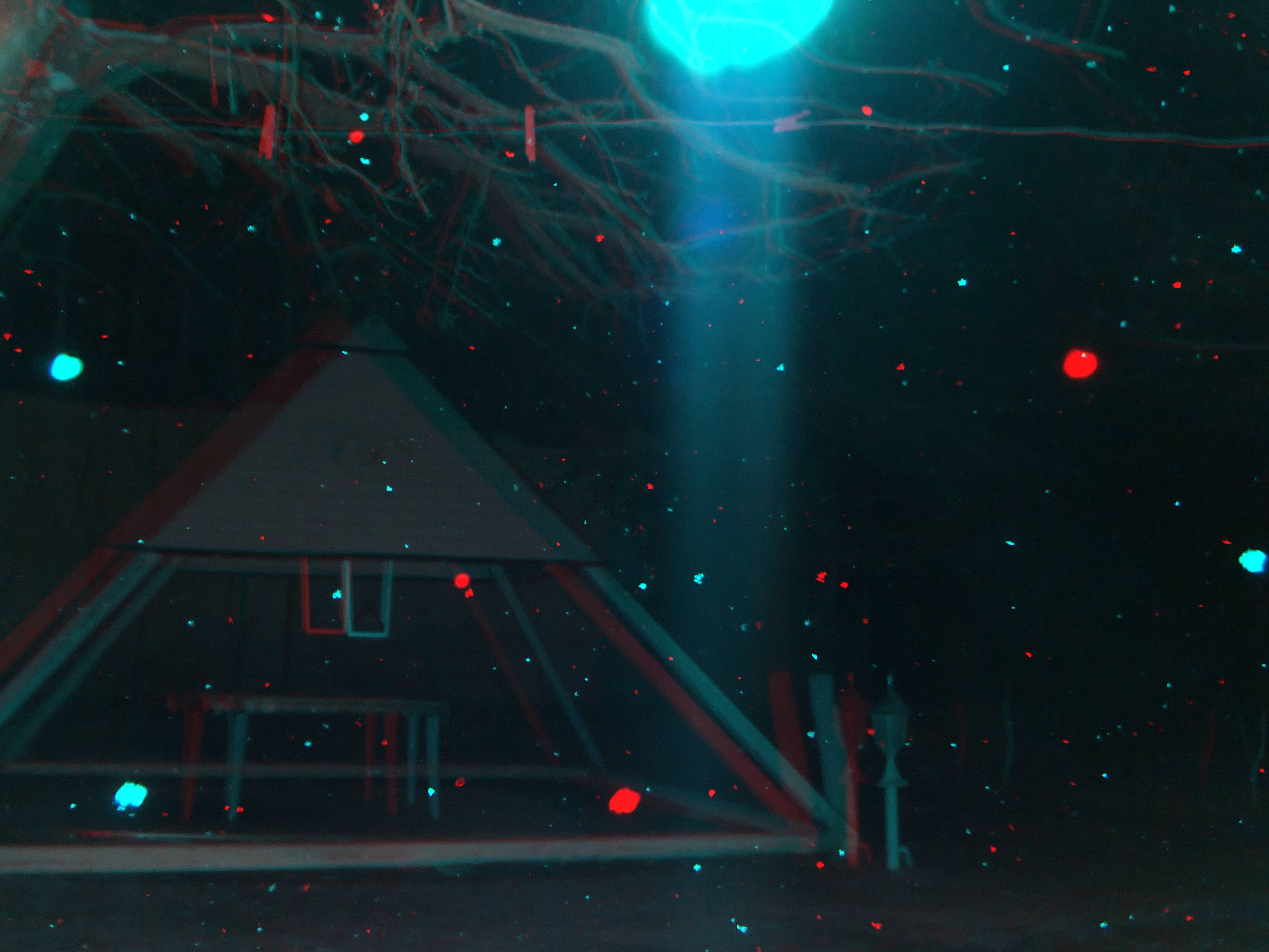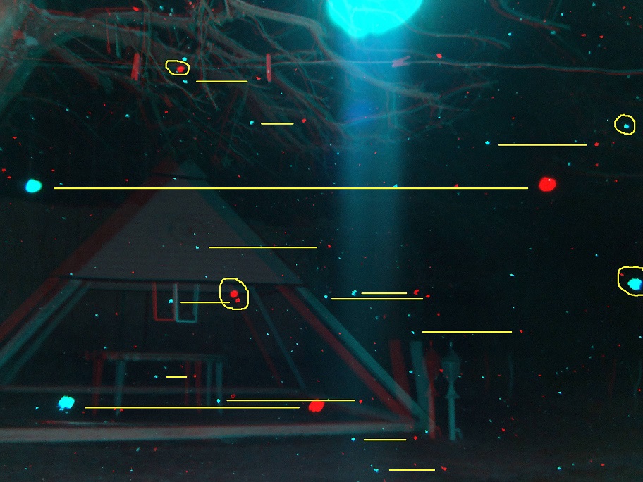 - Pentru început, vom exemplifica cu o fotografie anaglifă cu fulgi de zăpadă (foto 2). Ea a fost realizată de domnul Ioan Șuteu, unul dintre puținii români care au achiziționat un aparat foto 3D special pentru scopul studierii globilor luminoși. Vedem că fiecare fulg de omăt mai măricel apare în ambele poze (stânga-dreapta) ușor decalat. Cu alte cuvinte, același fulg apare colorat în cian (albastru-deschis) dacă provine din poza din stânga, și în roșu dacă provine din poza din dreapta. Fulgii sunt, prin urmare, obiecte reale, situate suficient de departe de aparat ca să poată fi înregistrate și percepute corect în spațiu.