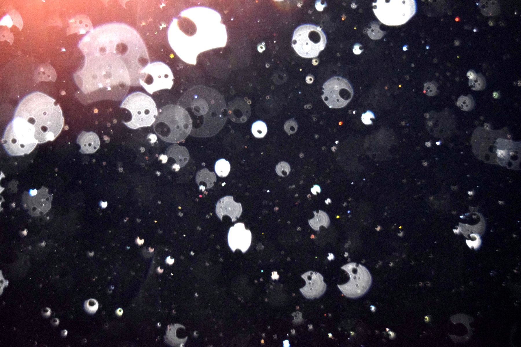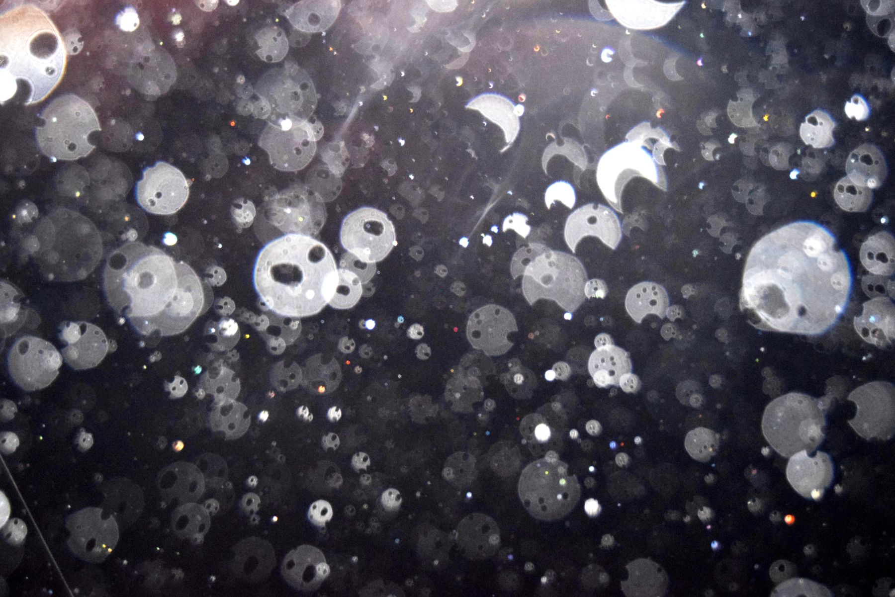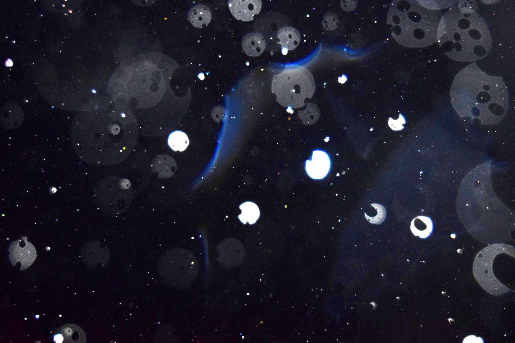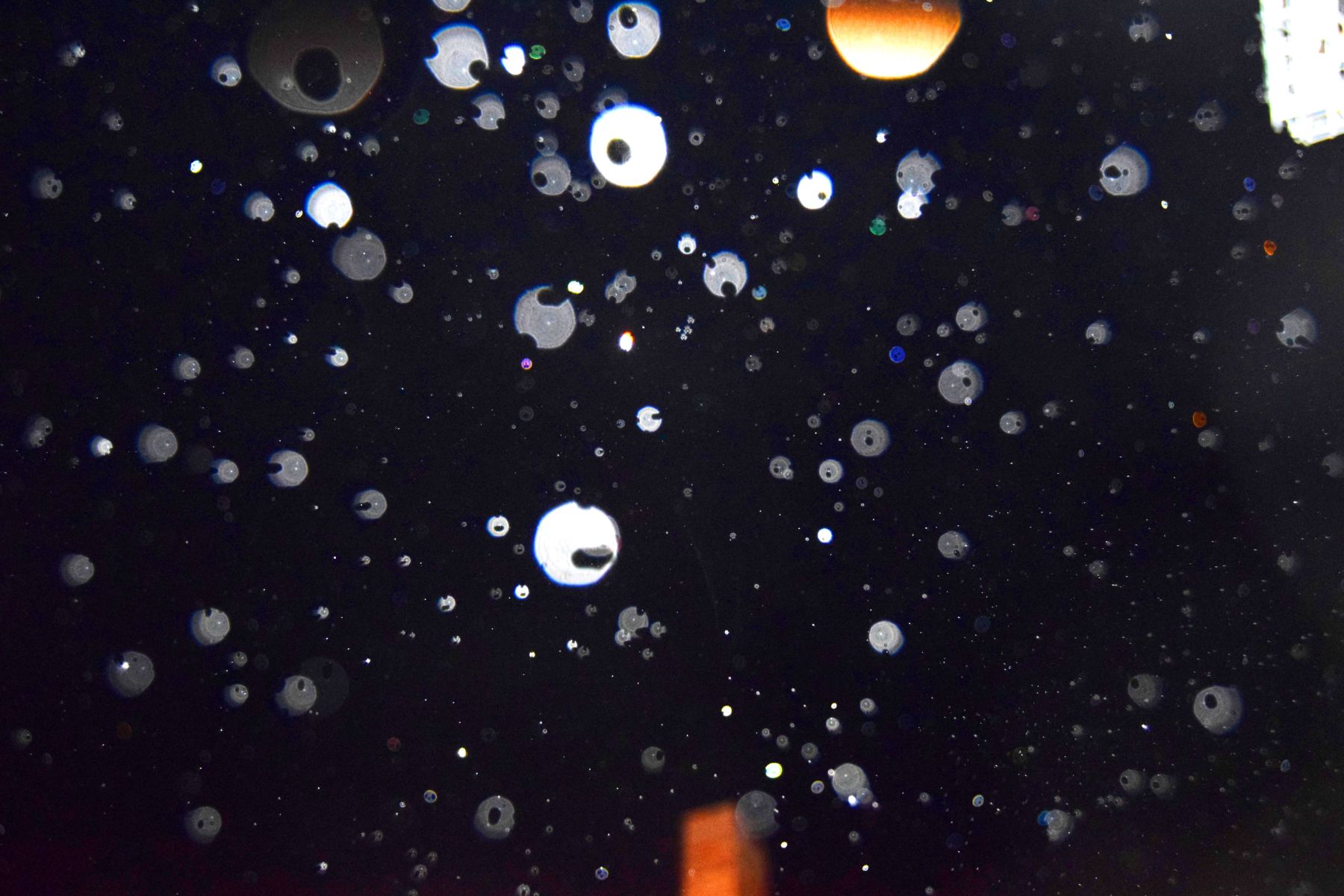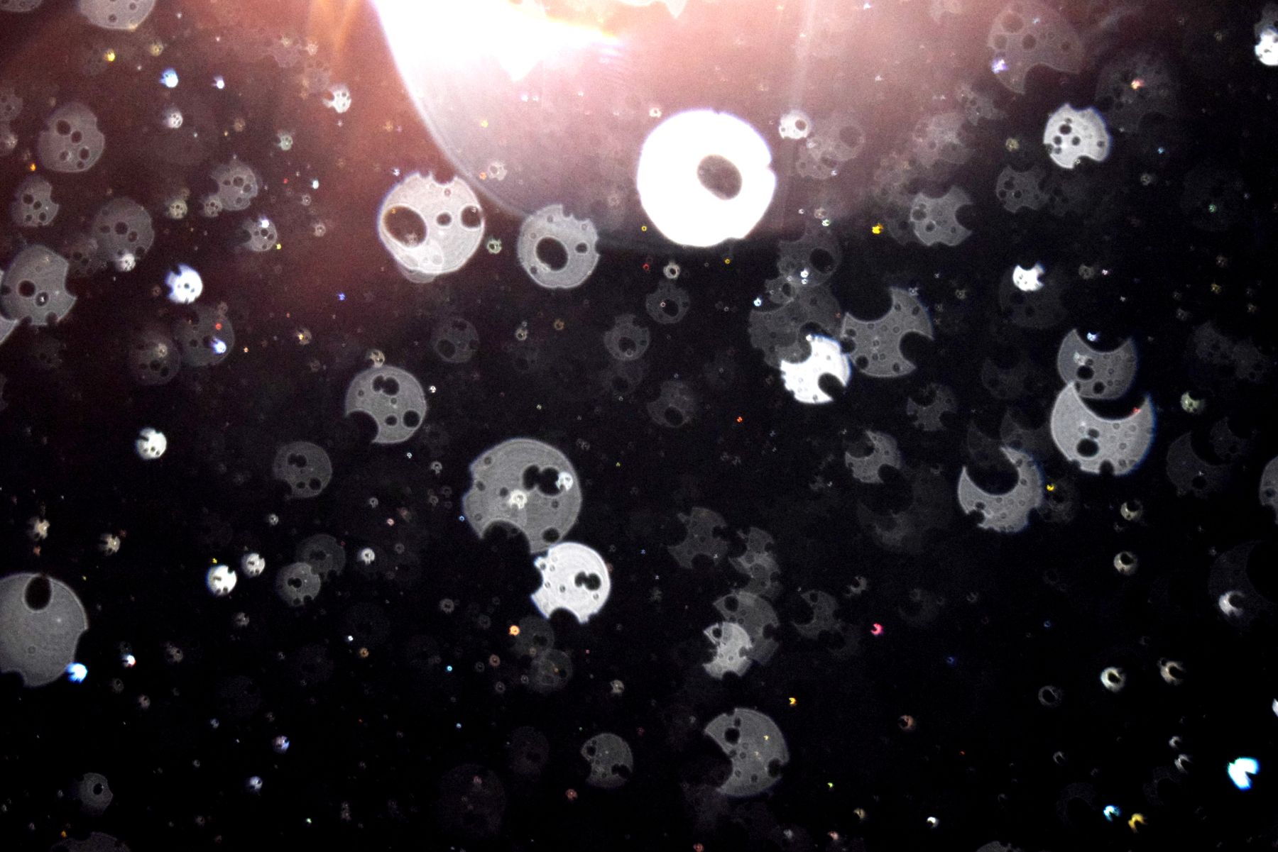 Unele fotografii cu globi luminoși întrec orice imaginație prin forma lor neașteptată. Priviți acești globi ciopârțiți, găuriți, a căror formă de "roți dințate" nu poate fi, în niciun caz, efectul unei simple reflexii a luminii în niște particule. (sursa)