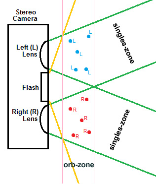 Fig.2 - Reprezentare schematică a conceptului de "orb-zone" sau zona unde sunt capturați globii luminoși cu un aparat foto stereoscopic. Zona se găsește între limita inferioară (aflată la câțiva milimetri de lentile) și limita superioară (cel mult unde se intersectează câmpurile vizuale ale celor două obiective), fără ca imaginea să poată fi focalizată de lentile.
