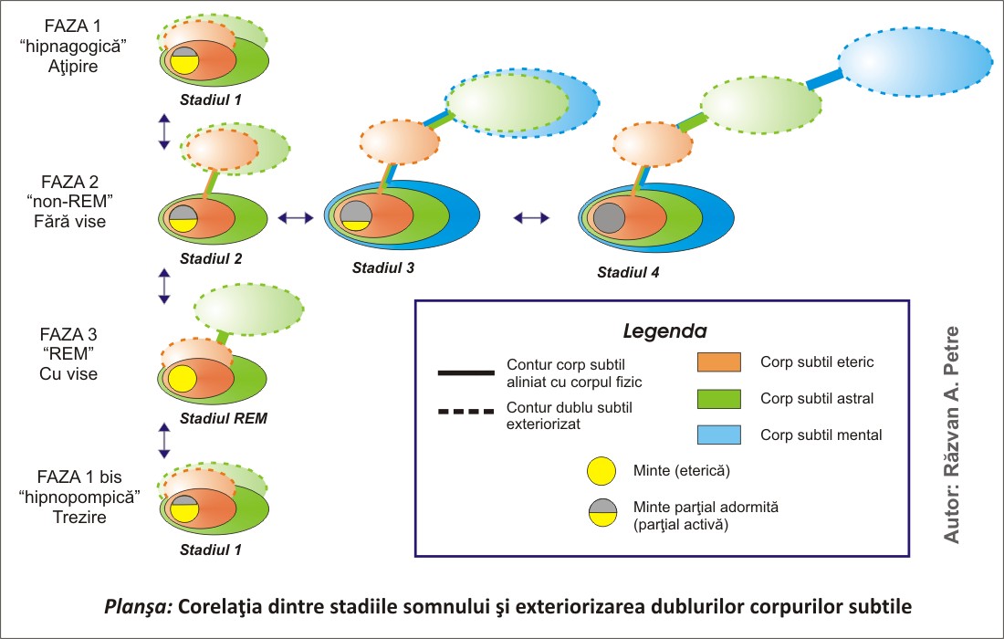 Folosind raţionamentul şi informaţii de la autorii esoterici Scarlat Demetrescu şi Robert Bruce, am realizat următoarele corelaţii între stadiile somnului şi poziţia dublurilor subtile: