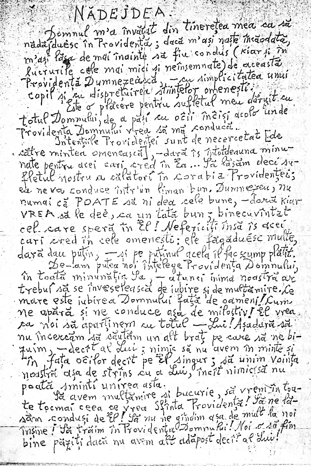«Domnul m-a învăţat din tinereţea mea ca să nădăjduiesc în Providenţă; dacă m-aş naşte încă o dată, m-aş lăsa de mai înainte să fiu condus (chiar şi în lucrurile cele mai mici şi neînsemnate) de această Providenţă Dumnezeiască – cu simplicitatea unui copil şi cu dispreţuirea ştiinţelor omeneşti.