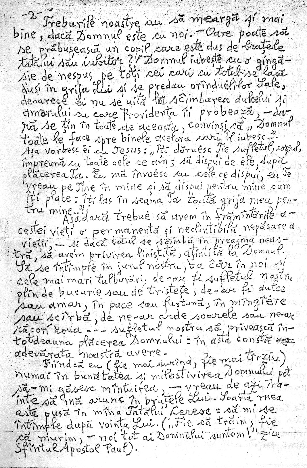 Fiindcă eu (fie mai curând, fie mai târziu) numai în bunătatea şi milostivirea Domnului pot să-mi găsesc mântuirea – vreau de azi înainte să mă arunc în braţele Lui. Soarta mea este pusă în mâna Tatălui Ceresc: să mi se întâmple după voinţa Lui. („Fie că trăim, fie că murim, noi tot ai Domnului suntem!” zice Sfântul Apostol Paul)»