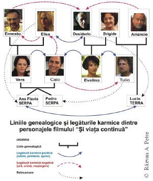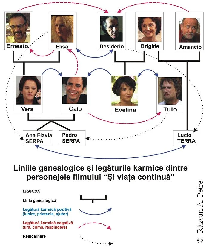 Pentru a înţelege mai bine relaţiile complexe dintre personajele filmului "ŞI VIAŢA CONTINUĂ" vã propun urmãtoarea schemã. Ea conţine liniile genealogice ale familiilor Terra şi Serpa, precum şi legãturile karmice dintre membrii lor. Oare nu cumva acelaşi gen de interacţiuni complexe acţioneazã şi în cadrul propriei noastre familii...?! (Răzvan Petre)